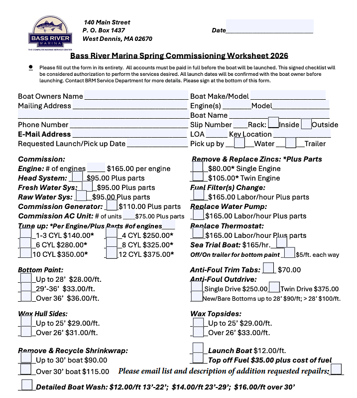 When the weather warms up, it’s time to take your boat out of wraps and get it ready for the season. Our service staff will perform the usual spring commissioning for your craft, including: remove and dispose of the shrink wrap, repaint the bottom and anti-foul the trim tabs and outdrive, charge the batteries, clean and wax the hull, topsides and cabin, clean and polish the brightwork and replace any canvas.
